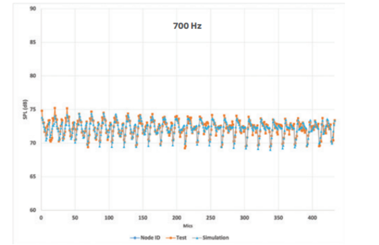 总体而言,在所有麦克风的测量和仿真之间实现了非常好的关联,在低频的差异很小,在高频的差异略大,但未影响仿真的整体质量。图6展示了一个特定麦克风处的声压级示例。