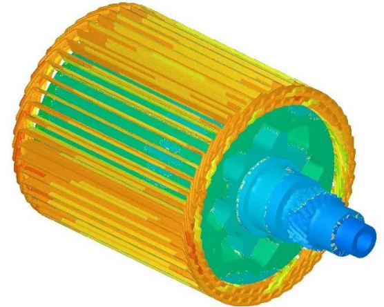 大致可分为齿轮组、马达本体、与马达的水冷管道。齿轮组除齿轮外,同时包含轴与轴承,全部将一起生成网格并分析。在传统做法上,限于复杂的几何处理,通常都切除此部分,只分析马达单体,不易了解齿轮于马达运作下的温度场。