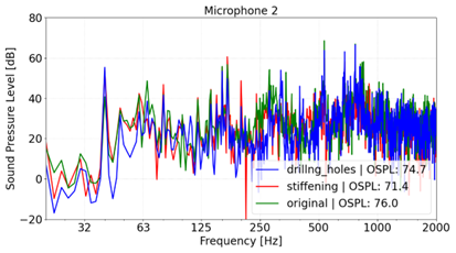 通过仿真验算,纵向加筋的方案(下图红色曲线)相对初始设计方案(下图绿色曲线)在关键的两个麦克风测点的噪声分别降低了3.2dB和4.6dB;而挖空的方案(下图蓝色曲线)在麦克风1点会增大噪声,麦克风2点会降低噪声。